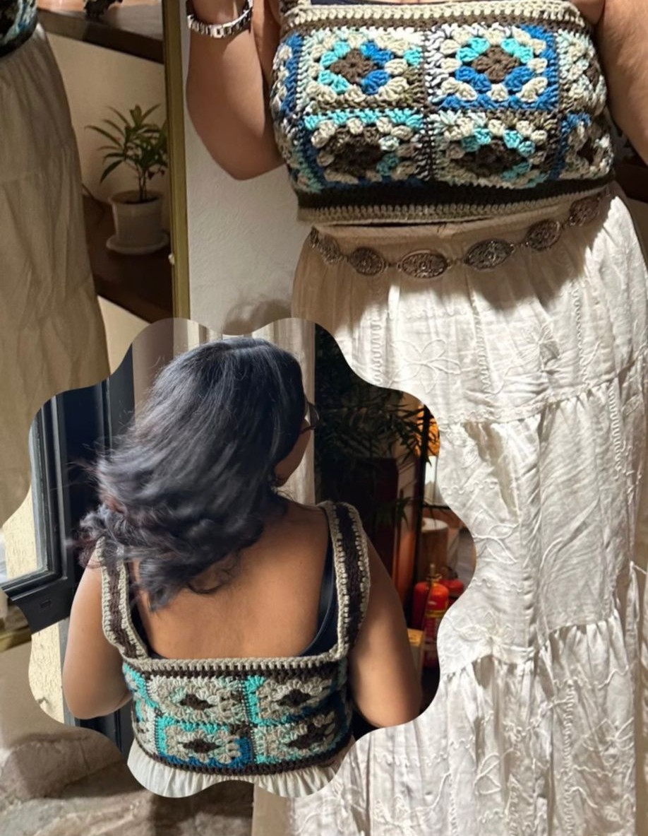 I wore it with a flowy white embroidered skirt and a silver medallion belt, and it was the perfect boho-birthday-lunch outfit. The structured granny squares against the soft skirt balanced each other out beautifully.